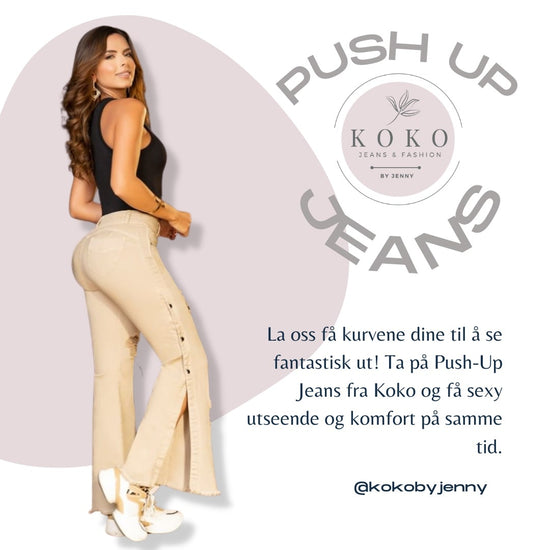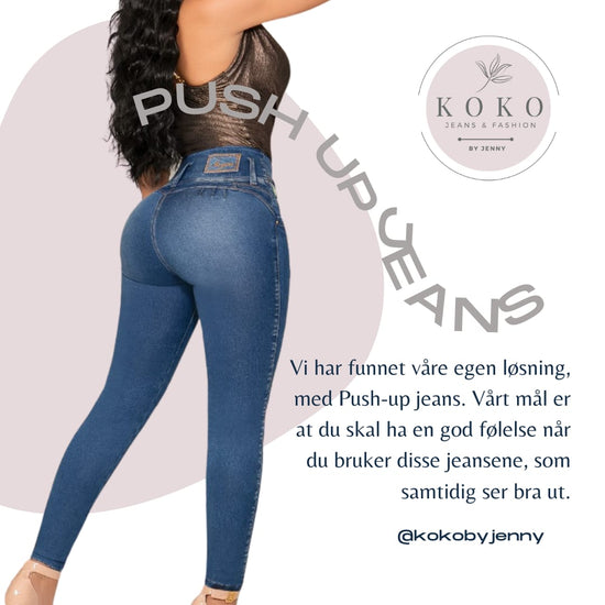 Vi er stolte av å kunne tilby deg de nye push-up jeansene! Dette er et patentert konsept, og det vil aldri se likt ut i noe annet sted som det gjør hos oss. Vi har satset på å lage en komfortabel og solide modell, med fokus på å fremheve dine feminine former. Kom i gang, bestill din favorittmodell!