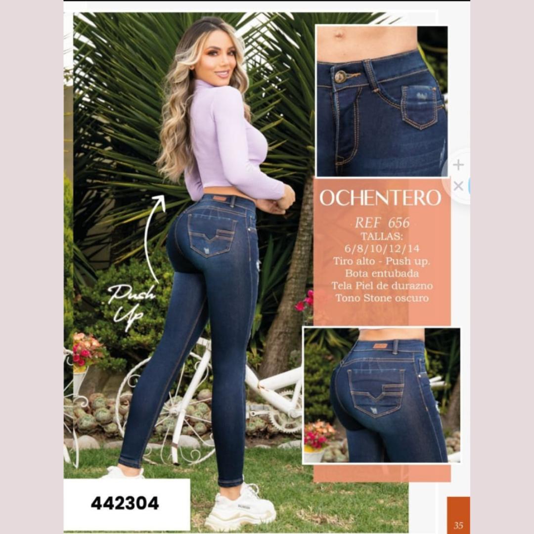 Jeans fra AngiePush-up effektenSkinny fitStretchy denimHøy midje med fine detaljerEn knapp og en giddeløstTo lommer bakFarge: blåModellen er 170 cm lang og har størrelse 38