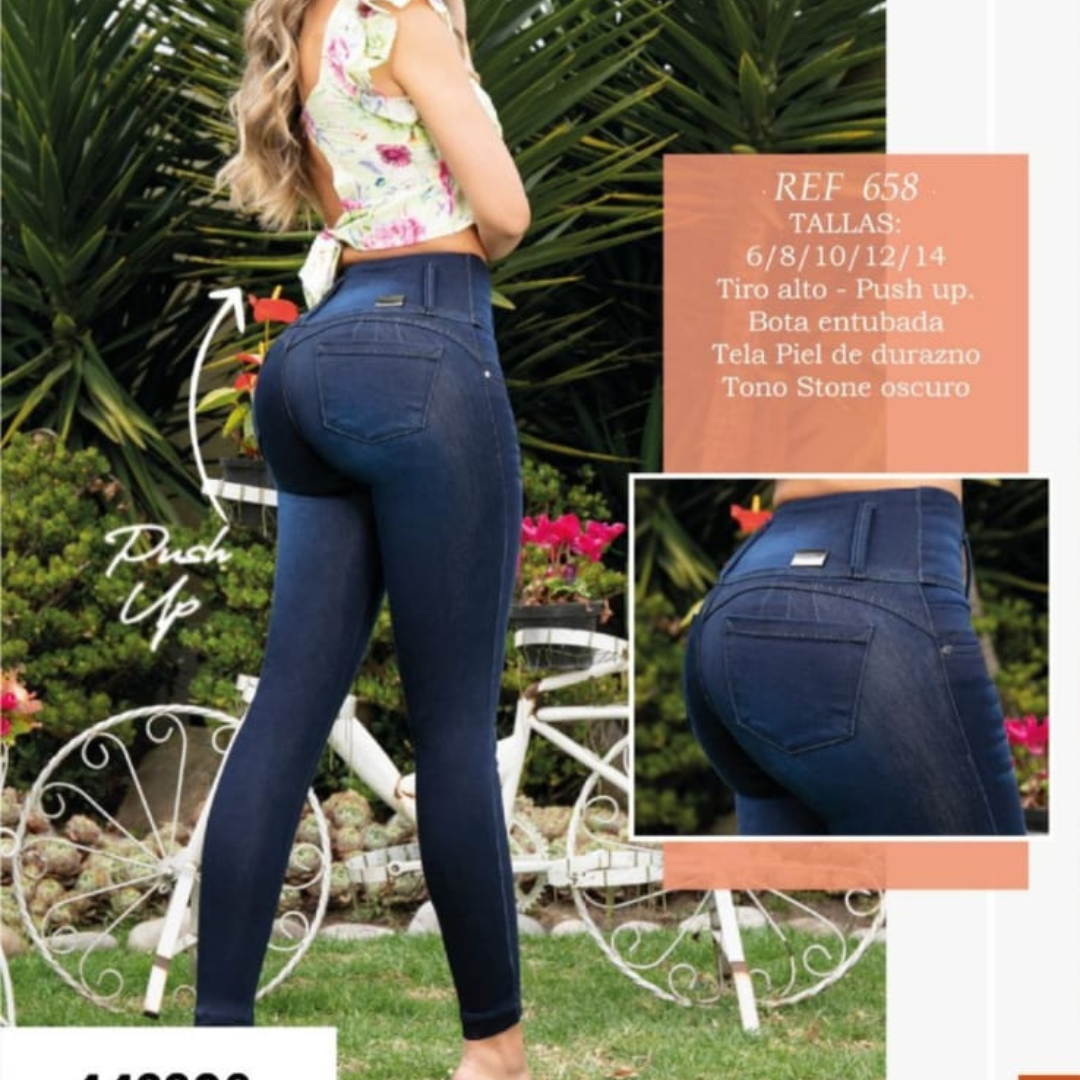 Jeans fra AngiePush-up effektenSkinny fitStretchy denimHøy midje med fine detaljerFire knapper og en giddeløstTo lommer bakFarge: blåModellen er 170 cm lang og har størrelse 38