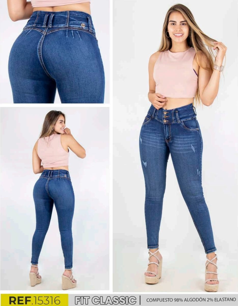 Disse jeansene har en høy midje, en glidelås og knapp lukning, to jukse frontlommer, skinny passform. Disse jeansene finnes i denimblått.