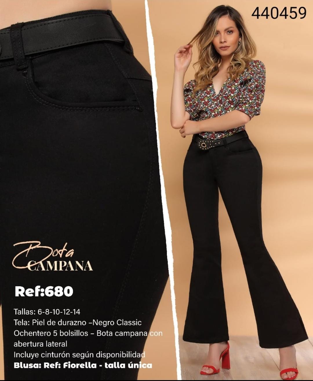 Denne boot cut jeansen har to baklommer, en splitt på sidene, beltestropper, høy midje, med push-up effekten og
