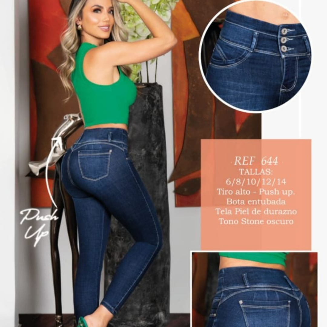 Jeans fra AngiePush-up effektenSkinny fitStretchy denimHøy midje med fine detaljerTre knapper og en giddeløstTo lommer bakFarge: blåModellen er 170 cm lang og har størrelse 38