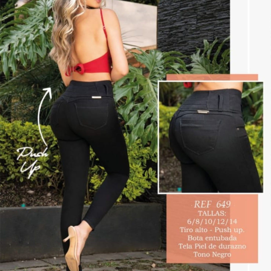 Jeans fra AngiePush-up effektenSkinny fitStretchy denimHøy midje med fine detaljerFire knapper og en giddeløstTo lommer bakFarge: svartModellen er 170 cm lang og har størrelse 38