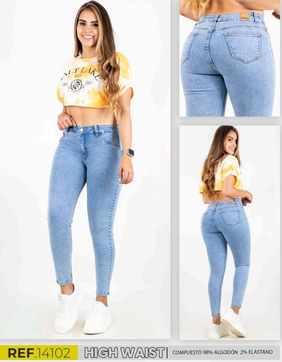 Disse jeansene har en høy midje, en design med to baklommer, en beltestropp og en glidelås og knapper lukning.