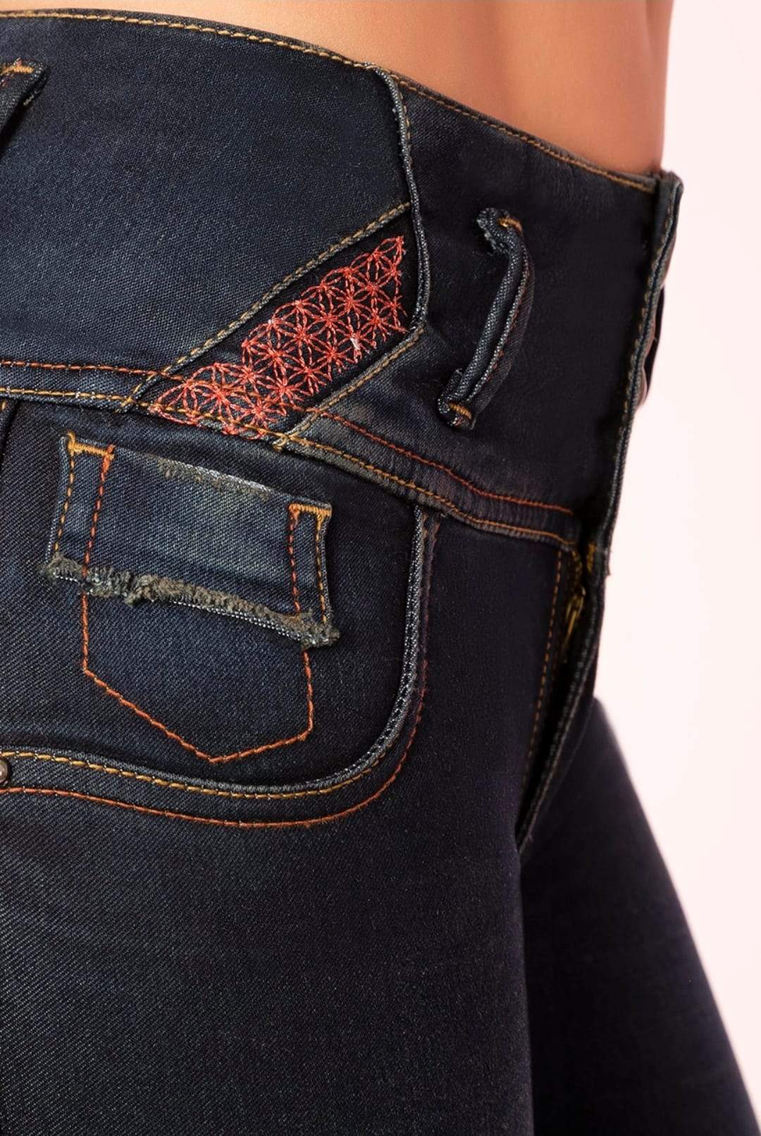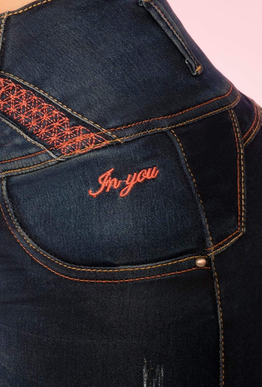 High Waist skinny fit med push-up effekten i behagelig tynt og elastisk stoff. Bred høy linning med vakre broderidetaljer i kontrasttråd. Dobbelt sømmer på baksiden. Fire knapper og en glidelås. Uten lommer. Normal i størrelsen.