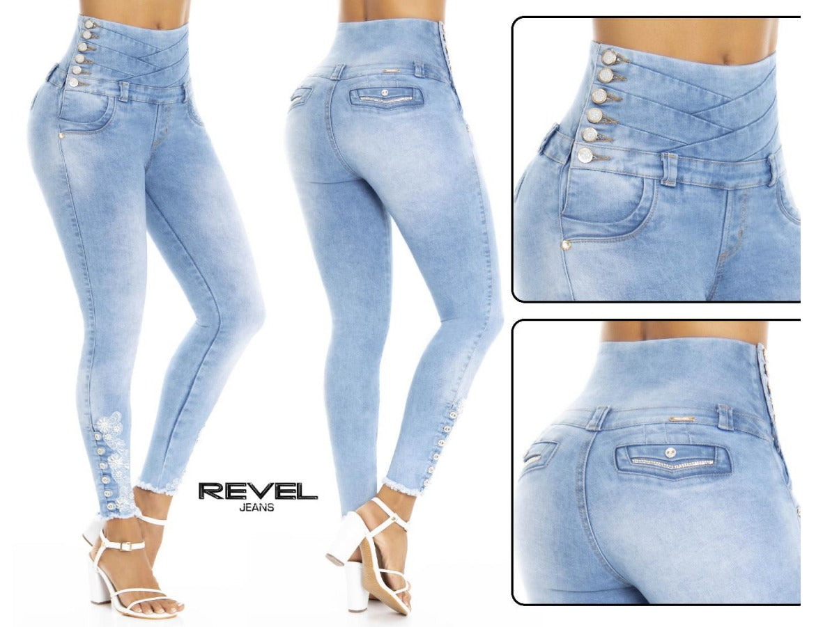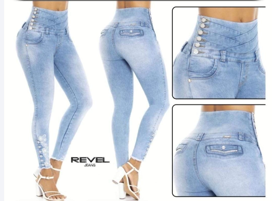 Jeans fra Revel Push up jeans Skinny fit Stretchy denim Høy midje og bredt belte med beltestropp Seks knapper Uten lommer Farge: Ice blue Modellen er 170 cm lang.