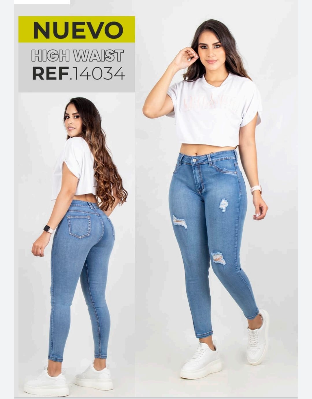 Skinny fit jeansen har to baklommer, beltestropper, høy midje, og en glidelås og en knapp lukning. Finnes i lyseblå vask.