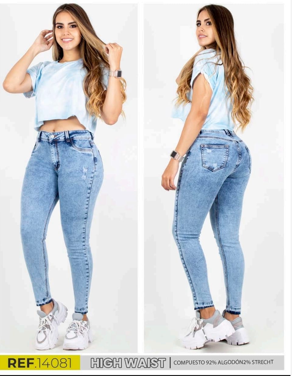 Skinny fit jeansen har to baklommer, beltestropper, høy midje, og en glidelås og en knapp lukning. Finnes i lyseblå vask