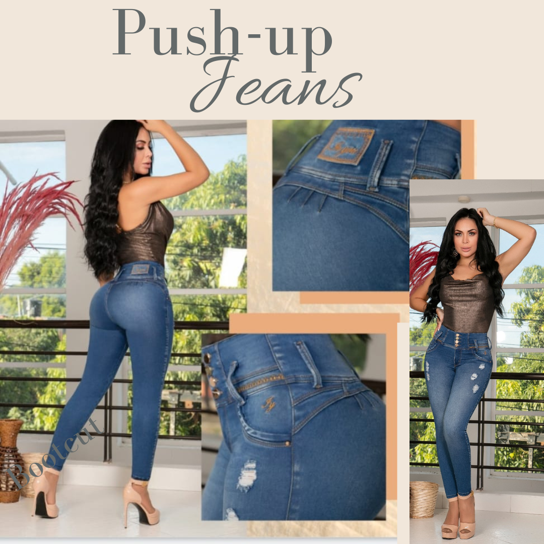 Jeansen beltestropper, høy midje og en glidelås og tre knapp lukning.