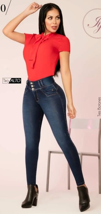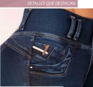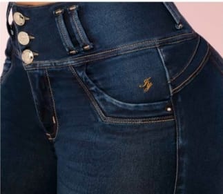 Normal i størrelsen Push up jeans Tre knapper og høy liv i mørkeblå farge med kontrastfargede tråder. Design med høy skinne silhuett, med mage kontroll og et montert snitt fra livet til leggen. Broderte detaljer på linningen og dobbeltsøm på baksiden.