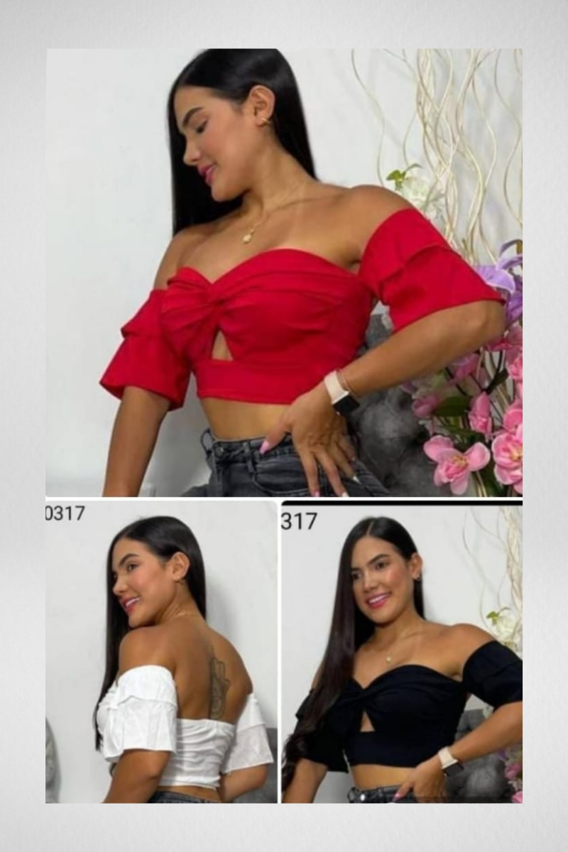 Denne blusen er åpen skuldre og innsnitt ved brystet. Puffermer med stram strikk så den sitter godt.