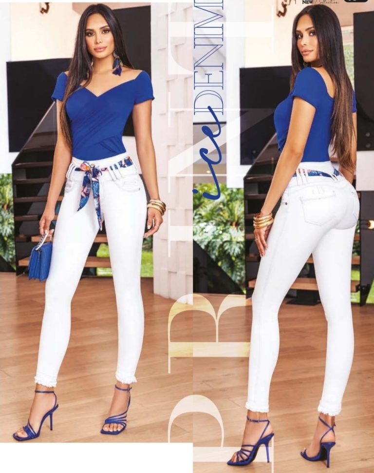 Denne boot cut jeansen har to baklommer, beltestropper, høy midje, med push-up effekten og en glidelås og knapp lukning.
